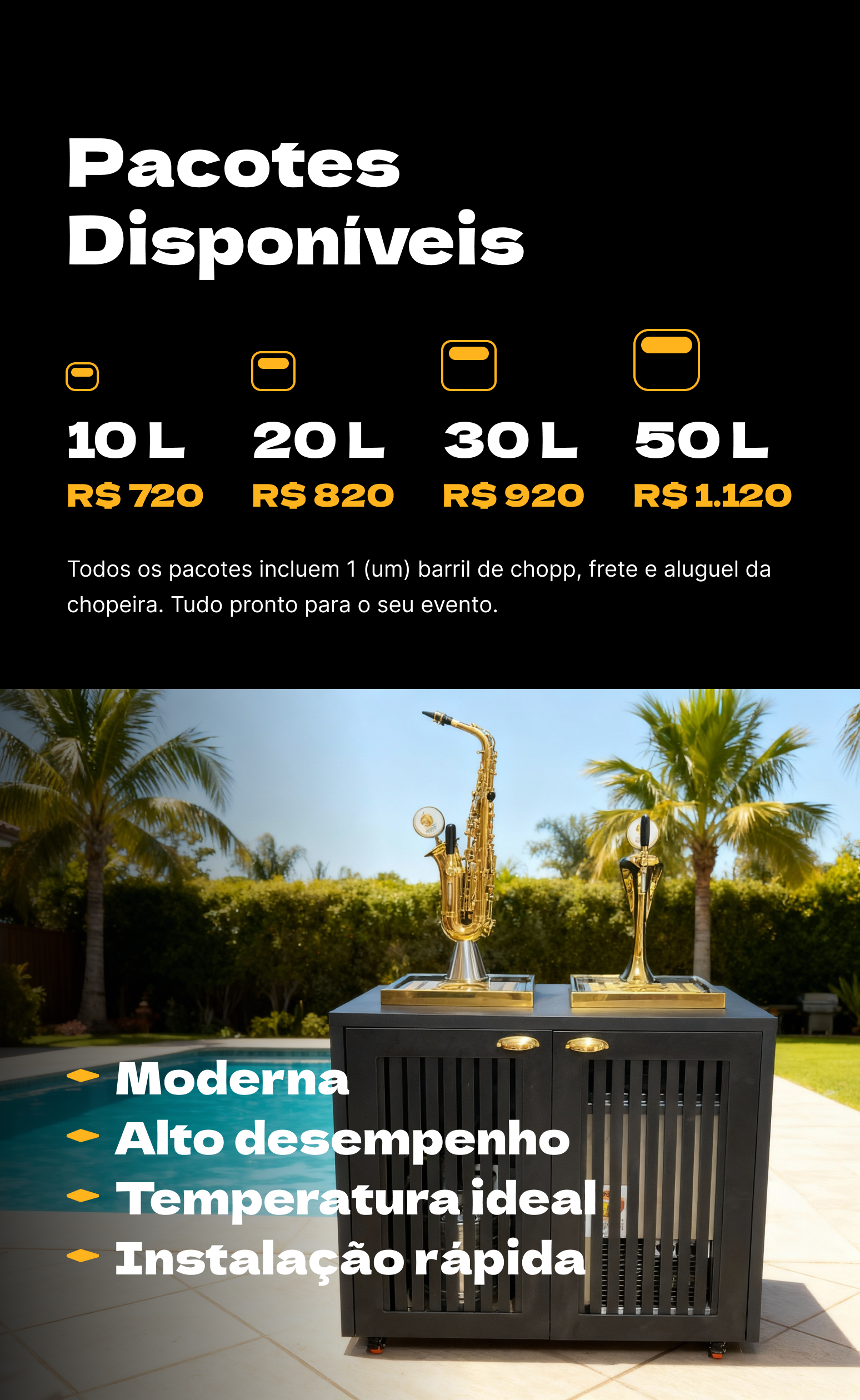 Inclui barril, CO₂, copos, instalação e suporte técnico.